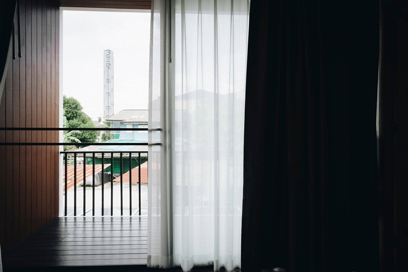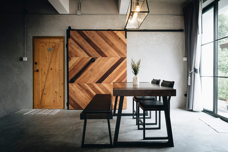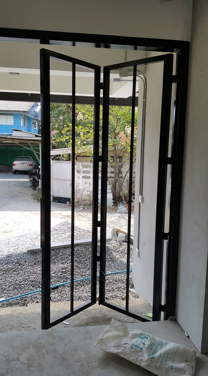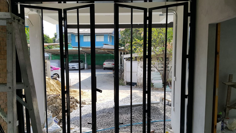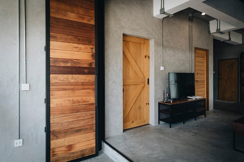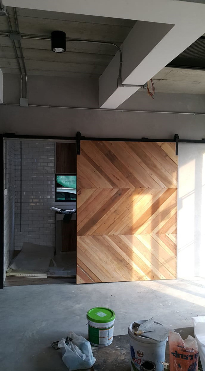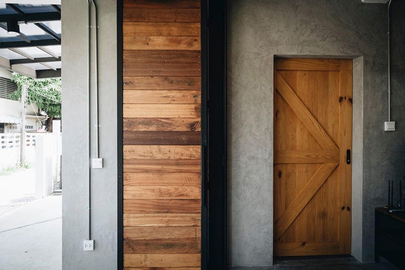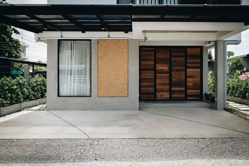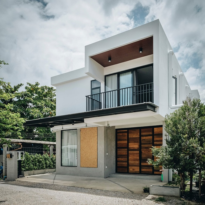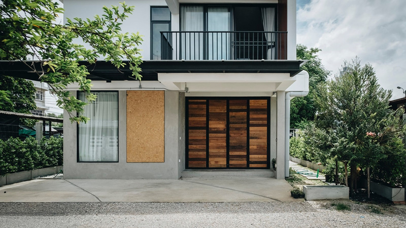 – ภายนอก เรียบเท่ ทันสมัย โดดเด่นด้วยประตูพับลายไม้และระเบียงชั้นสอง