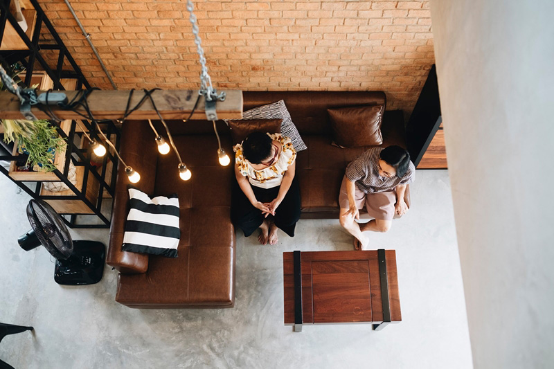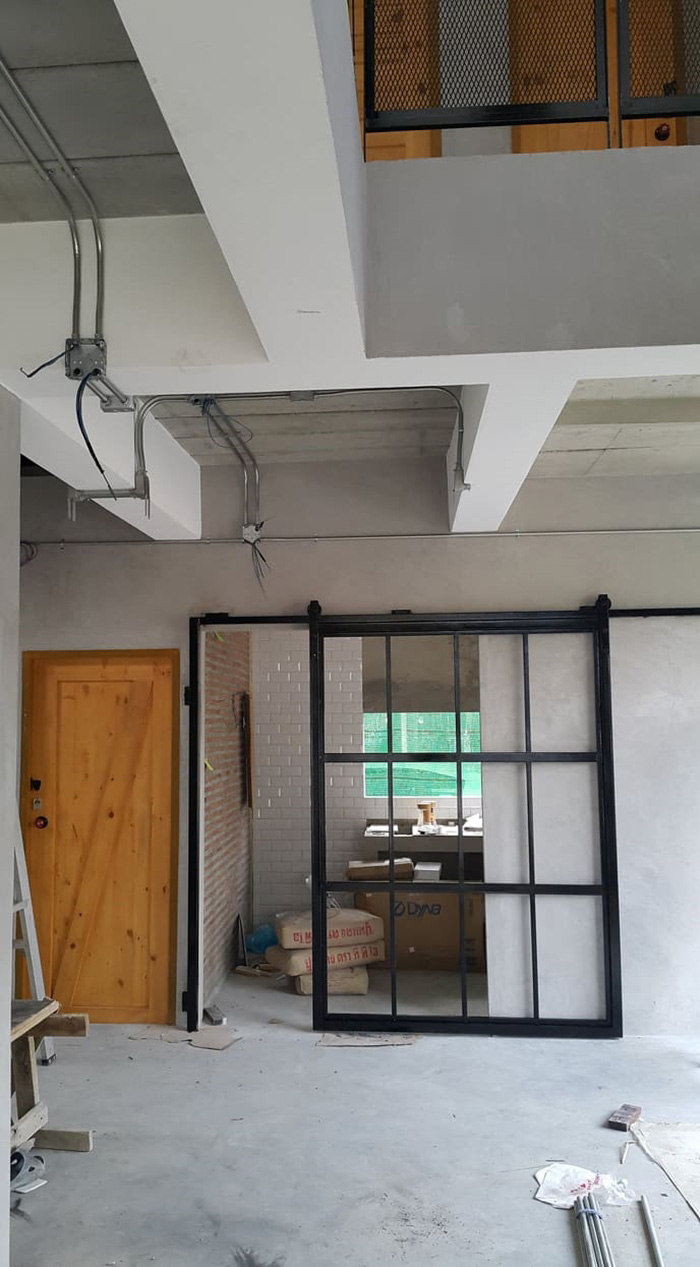 – ติดตั้งประตู-หน้าต่าง เฟอร์นิเจอร์ และของตกแต่ง โดยการจัดสรรพื้นที่ภายใน แบ่งห้องไว้ค่อนข้างเยอะเพื่อรองรับอนาคต แต่ห้องนอนจะเน้นแค่เฟอร์นิเจอร์สำหรับการนอนเท่านั้น เพราะมีห้องต่าง ๆ เช่น ห้องเล่นเกม ห้องนั่งเล่น ห้องดูทีวี และห้องทำงาน ไว้ให้ใช้ร่วมกันแล้ว พร้อมทั้งยังออกแบบสวยลอยฟ้าตรงบันได เจาะช่องไว้ปลูกต้นไม้แบบไล่สเต็ปขึ้นไปจนถึงแนวหลังคาบ้าน ช่วยเพิ่มความสดชื่นและอากาศบริสุทธิ์ไปในตัว