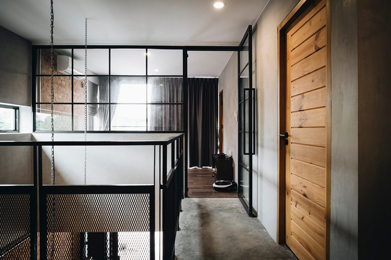– ชั้นสองมีห้องนอนใหญ่อยู่บริเวณหน้าบ้าน ใช้ประตู-หน้าต่างกระจกใสเพื่อความปลอดโปร่ง แถมคงความลอฟท์เอาไว้เหมือนเดิม เพิ่มเติมคือเพิ่มกิมมิกที่ชั้นวางของทรงสูงโปร่งติดเพดาน เห็นแล้วสวยงาม น่าอยู่ ต้องขอยอมรับเลยว่าออกแบบและตกแต่งได้เนี้ยบมากจริง ๆ